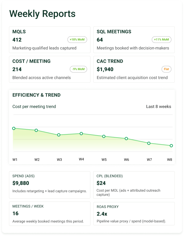 - Pro-level campaign setup, scaling, A/B testing, call tracking, bi-weekly reports