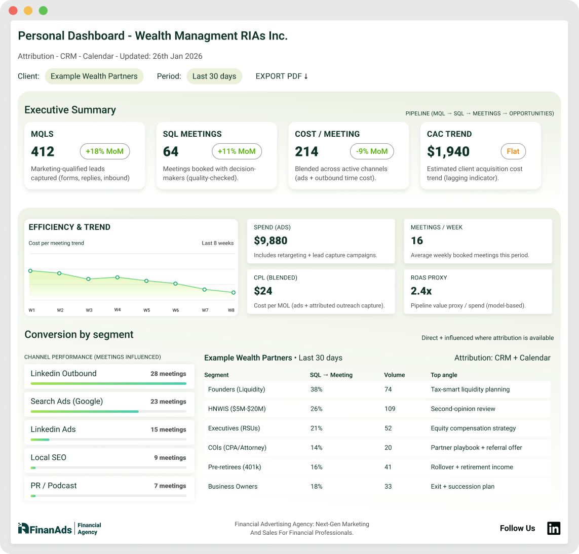 - Google Ads: High-intent campaigns for “wealth manager London” and “IFA Mayfair” with call tracking and conversion forms.