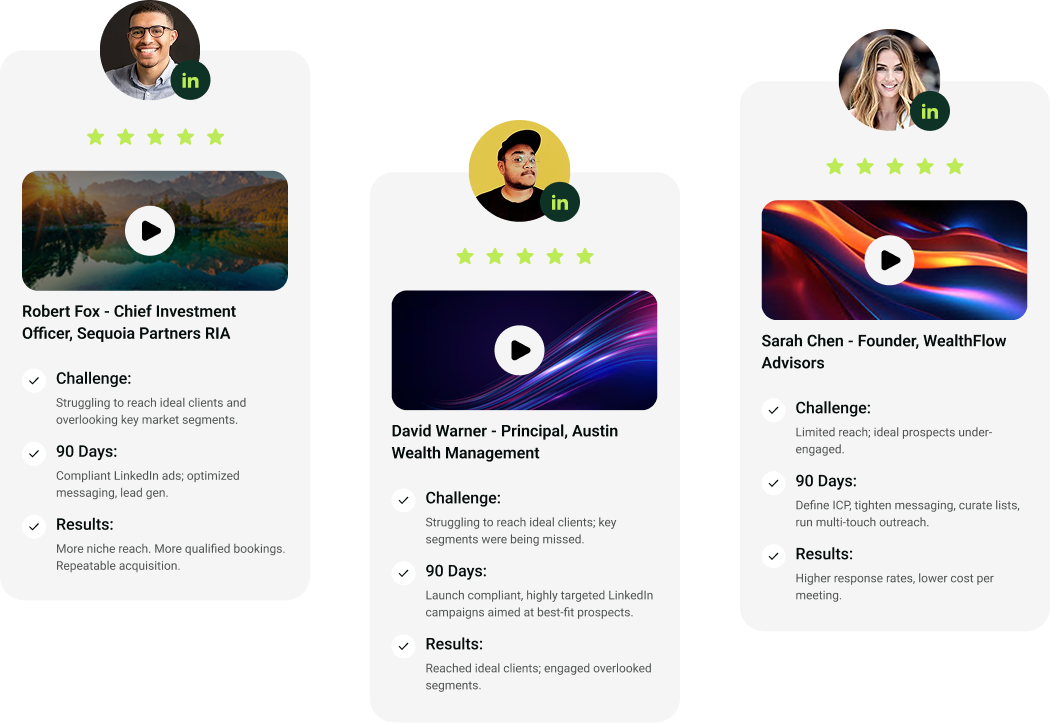 We specialize exclusively in helping RIAs, wealth managers, and advisory firms succeed—giving you growth, results, and regulatory peace of mind.